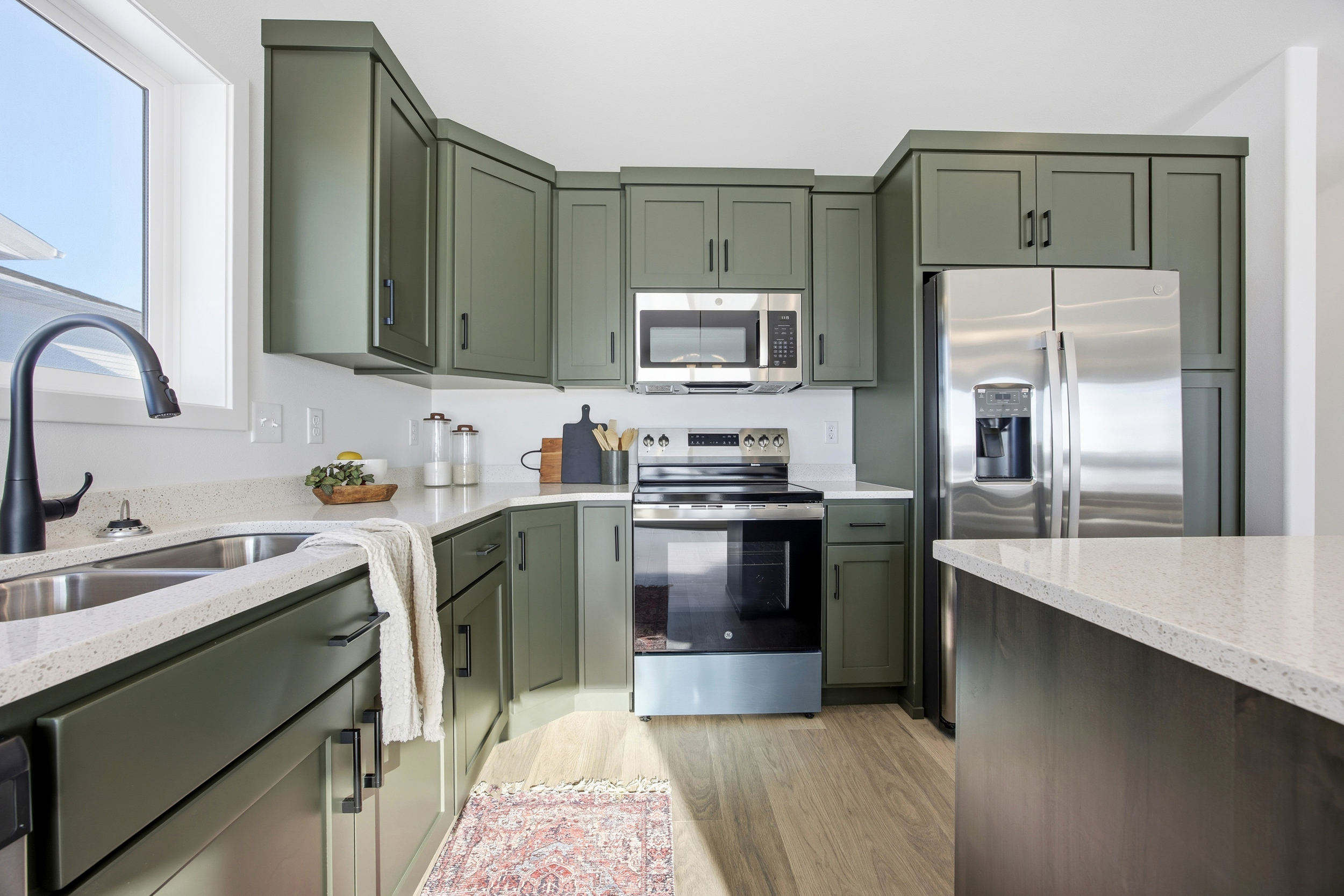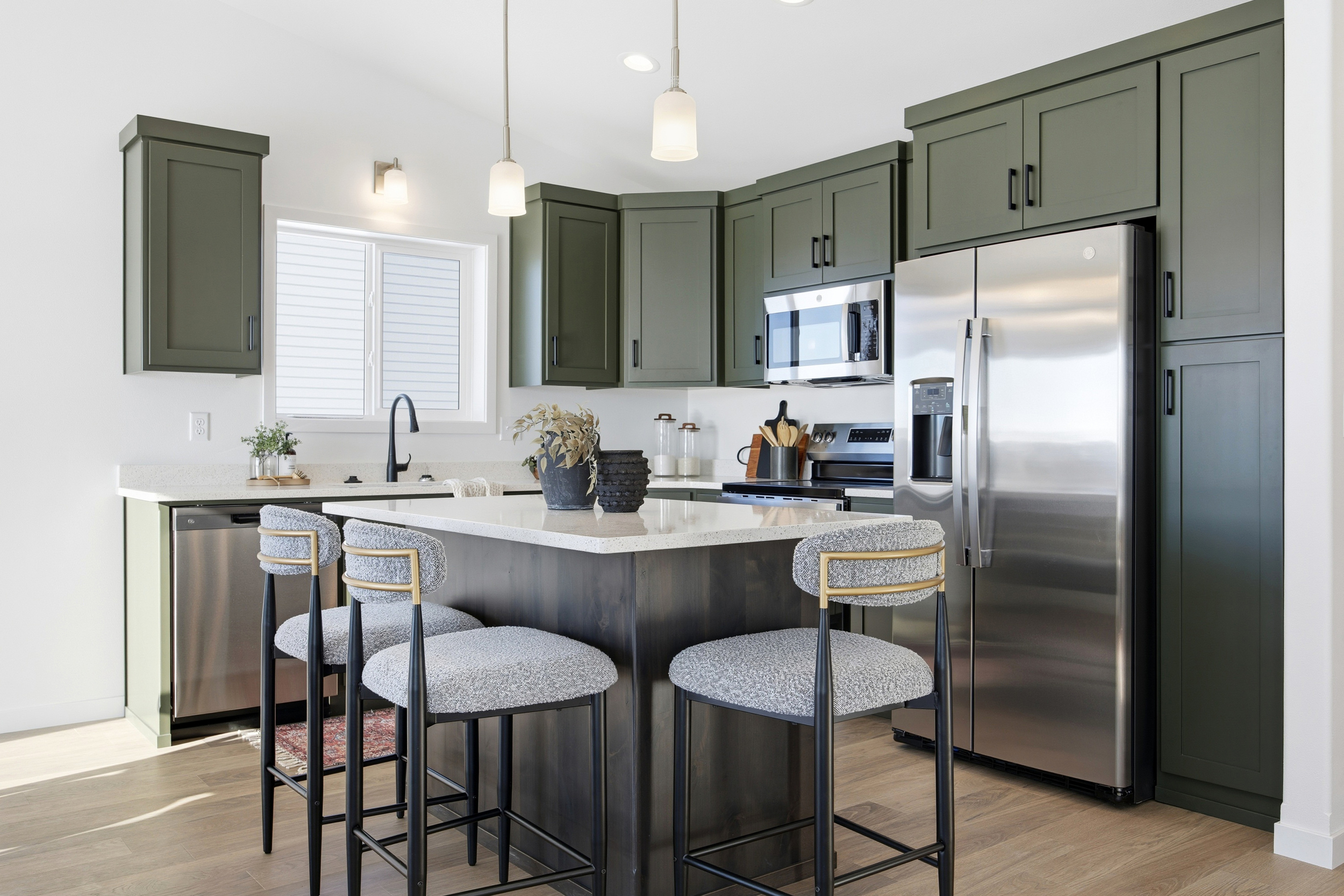 At the heart of the home, the kitchen is a dream for any home chef, offering an abundance of custom cabinetry in earthy tones, generous counter space, and a large center island perfect for gathering, prep, and casual dining. This model also includes a walk-in pantry for extra storage. A conveniently located half bath sits just off the living room for guests.