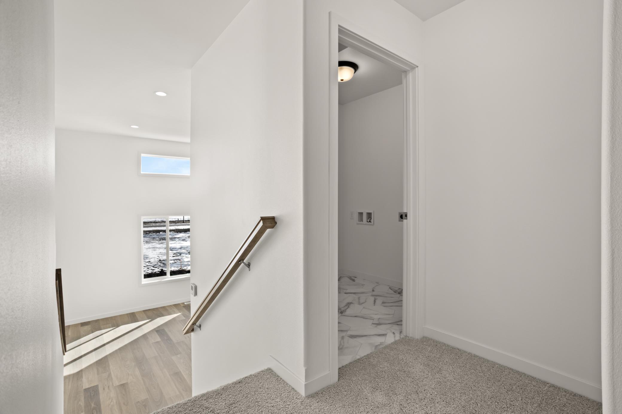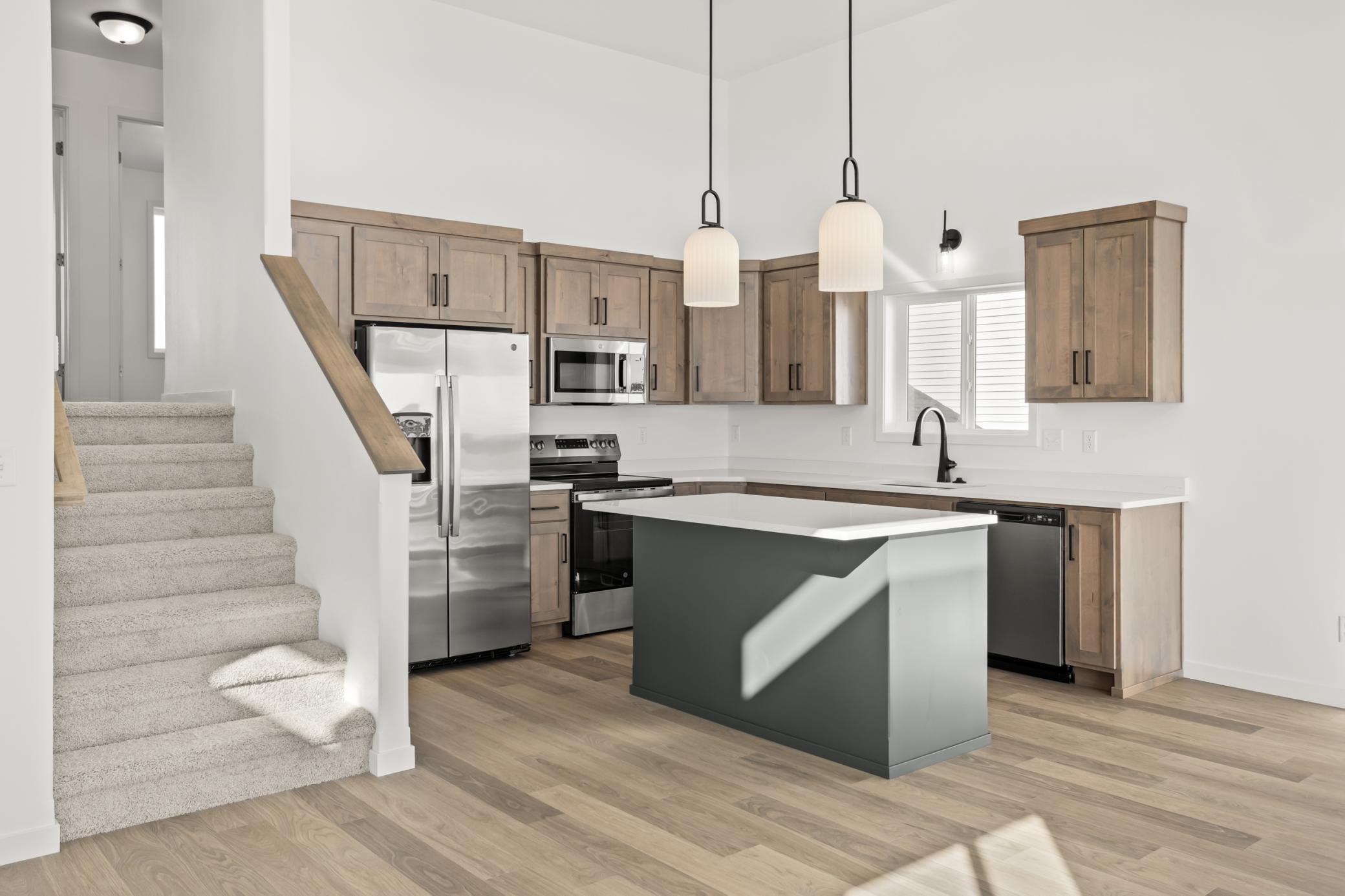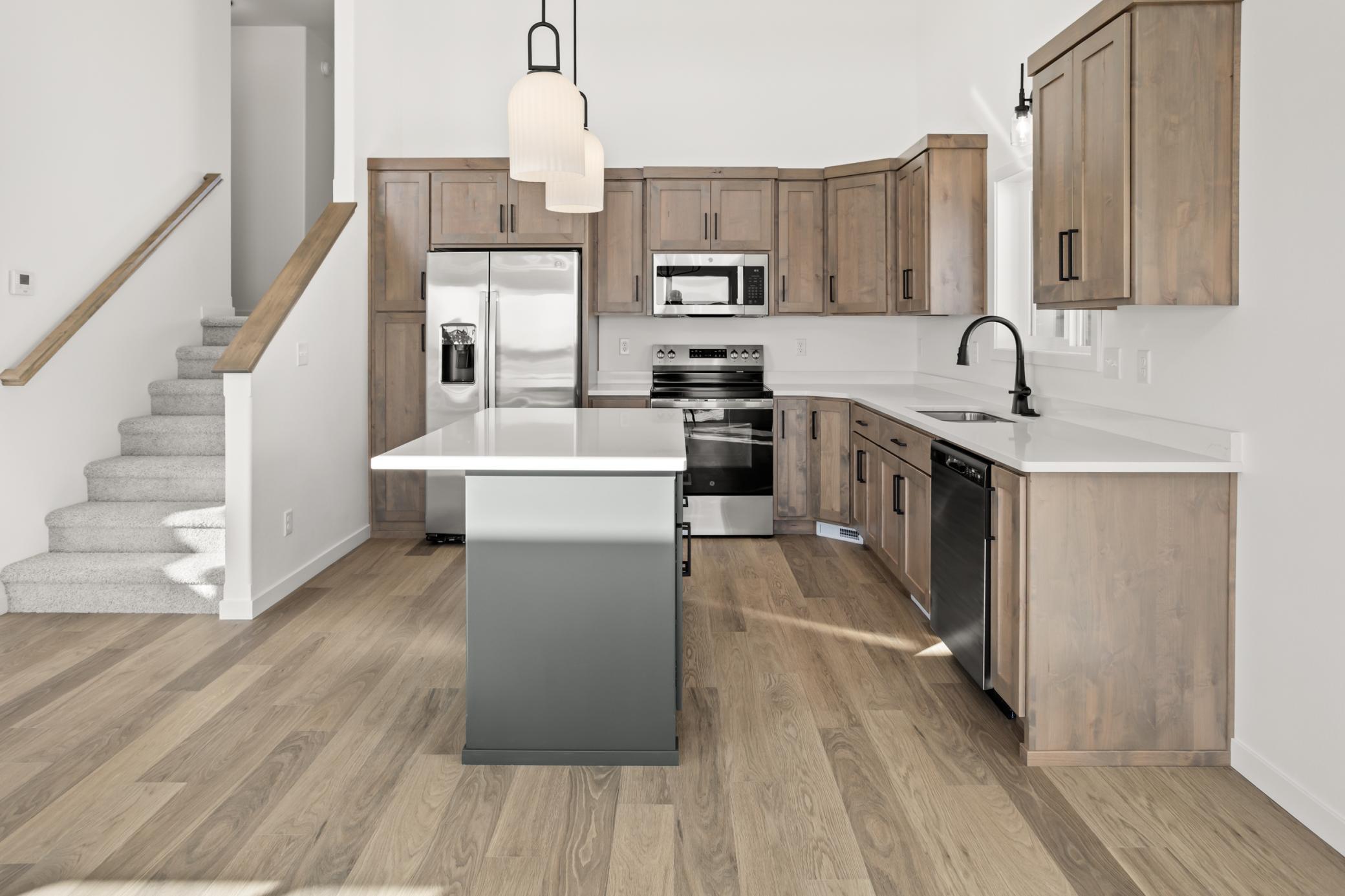 The kitchen is the heart of the home, offering earthy, two-tone cabinetry, a spacious island, and a breakfast bar—perfect for casual dining and gathering with family or guests. Upstairs, the upper level includes a private primary suite complete with a walk-in closet and ensuite bathroom, an additional bedroom, a full bathroom, and a conveniently located laundry room.