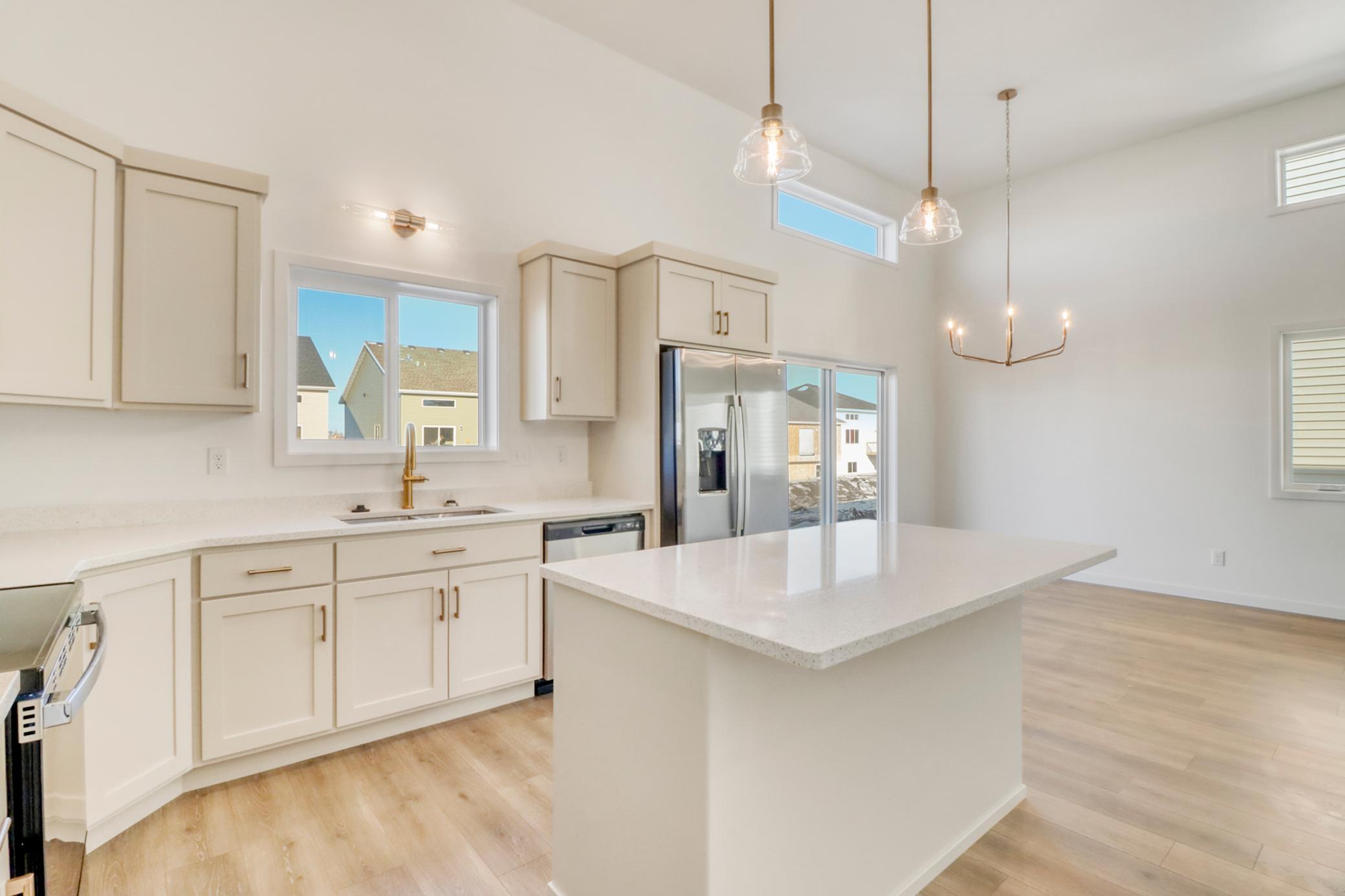 The kitchen is a true highlight, designed for both beauty and function. It features elegant, painted cabinetry in creamy tones, generous counter space, and a central island—perfect for everyday living and entertaining alike. Bronze light fixtures and accents add pops of eye-catching appeal.